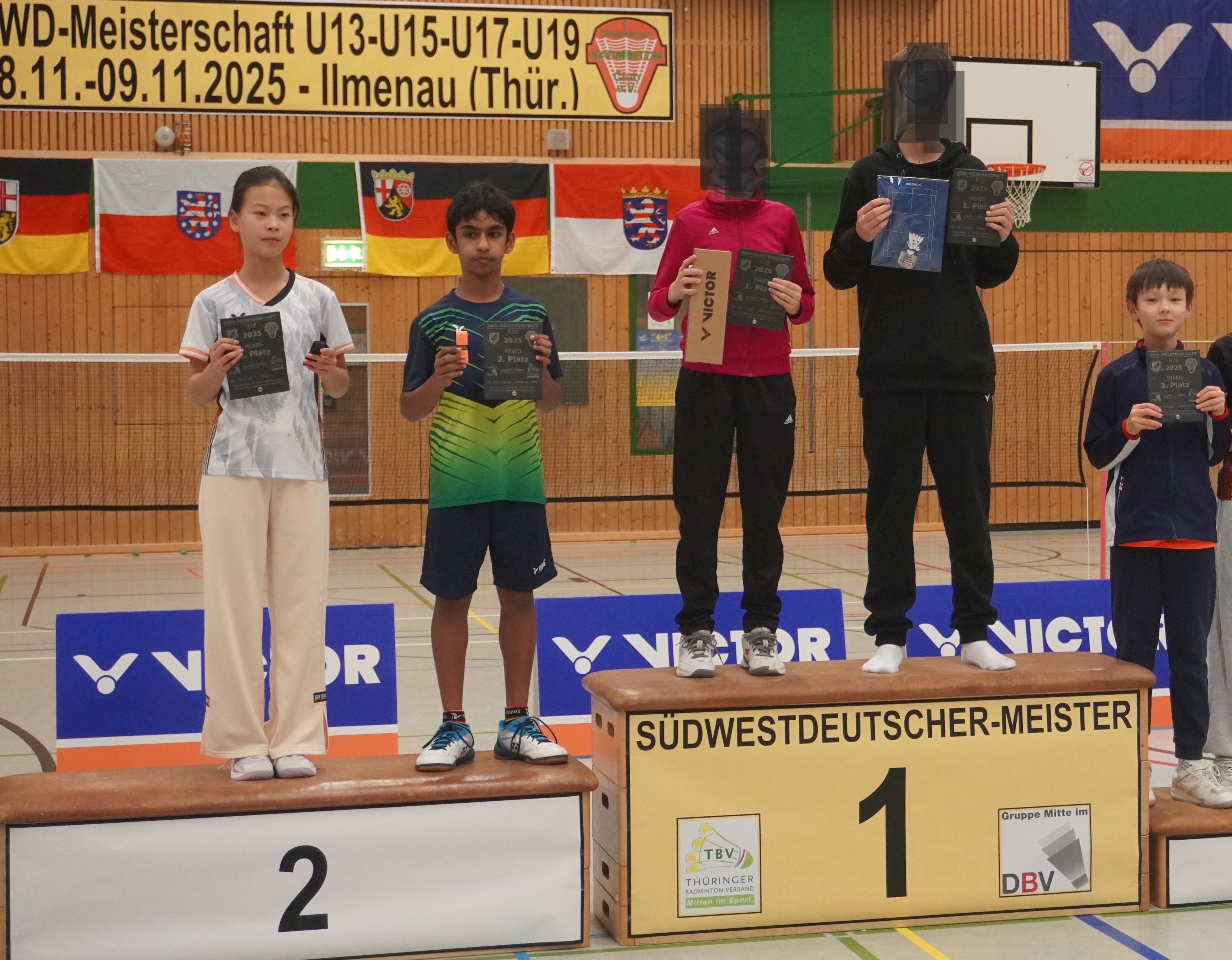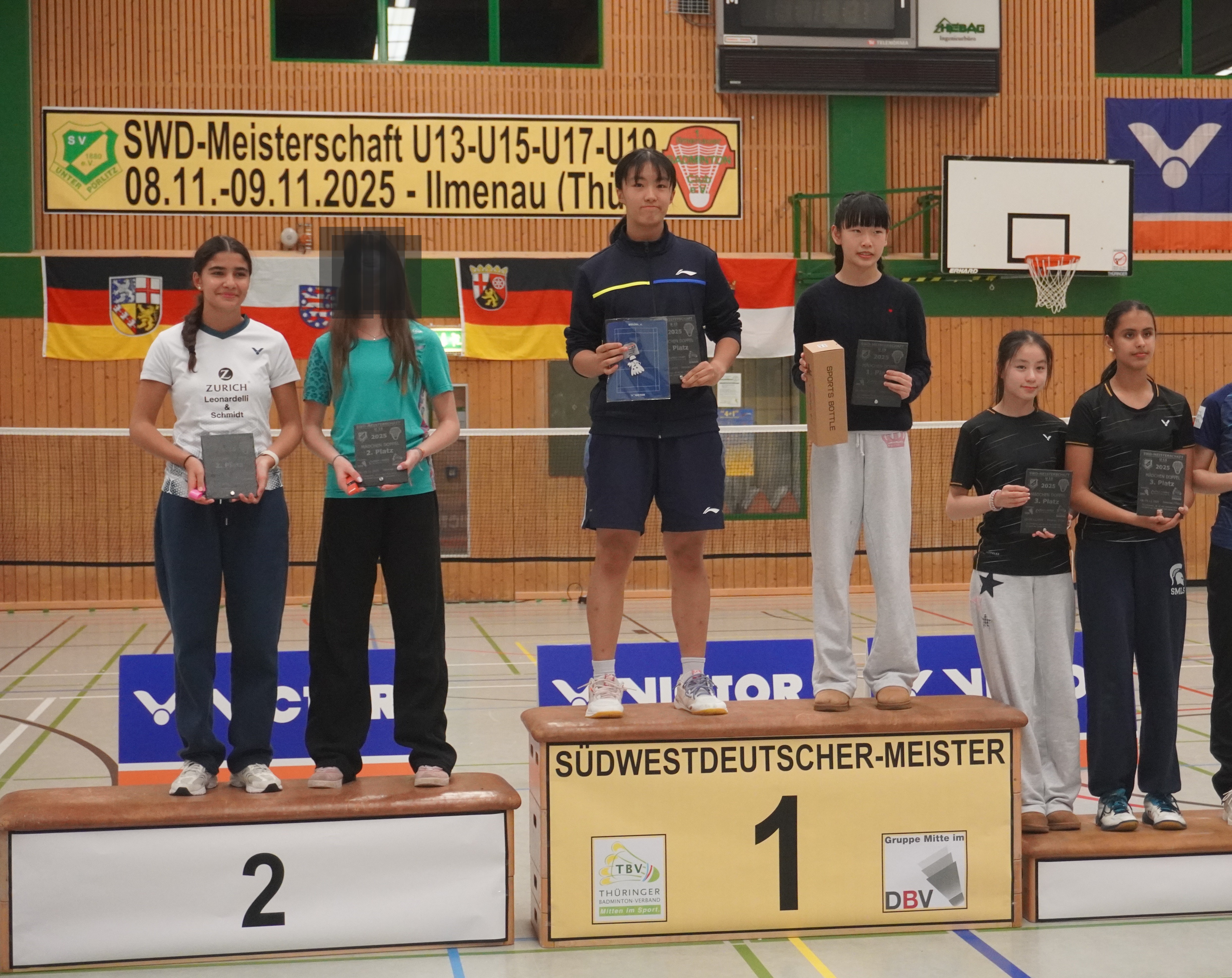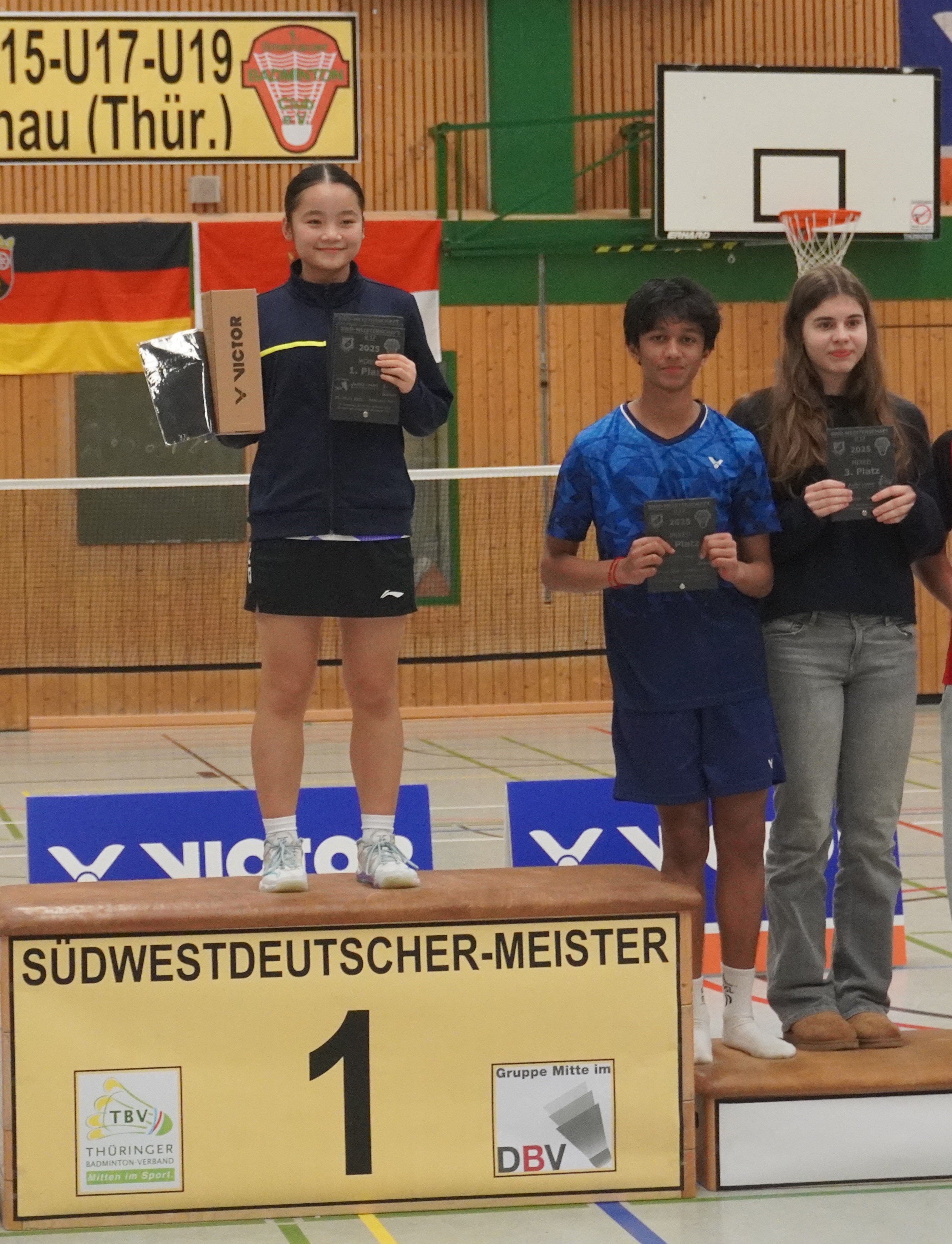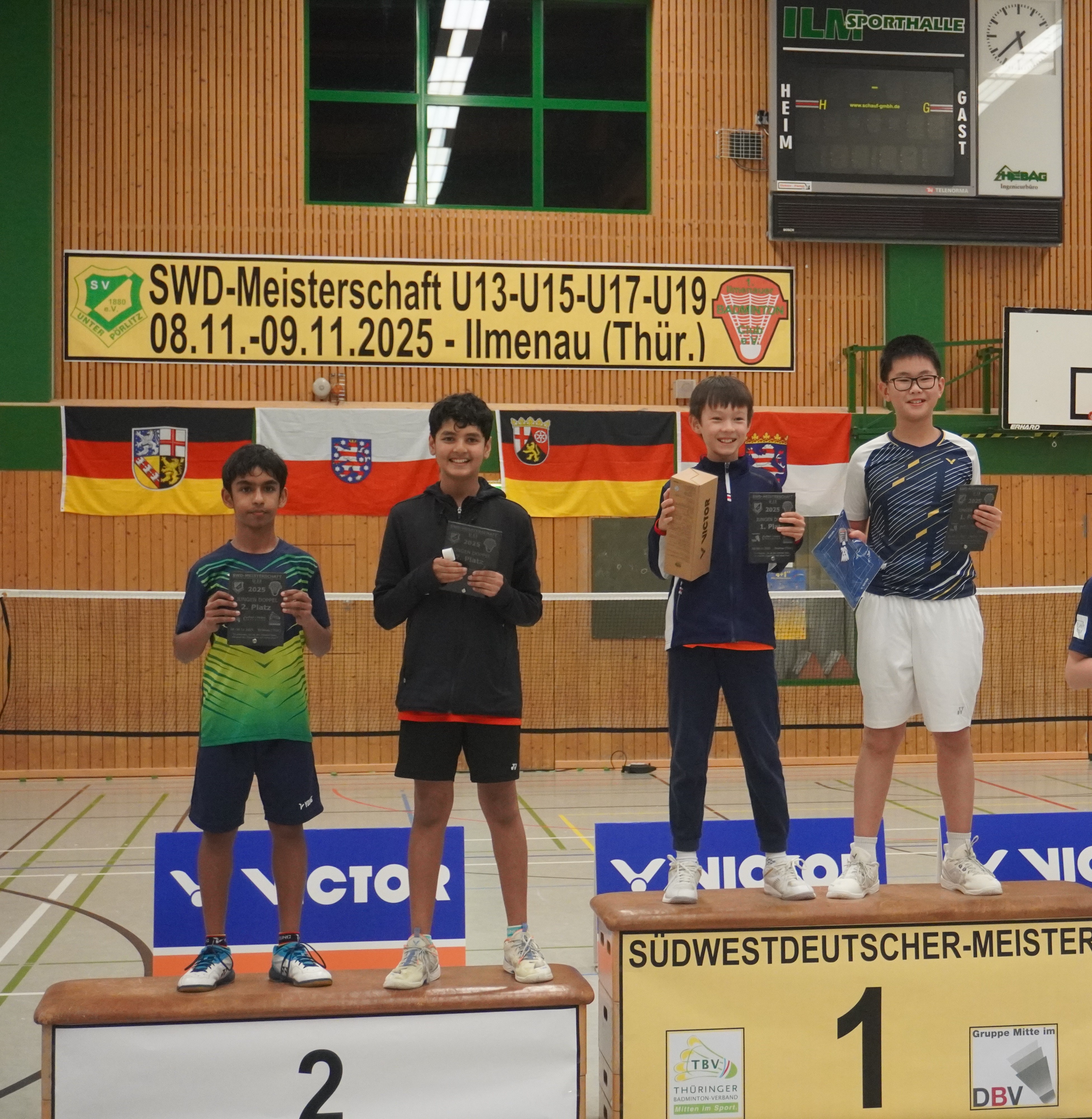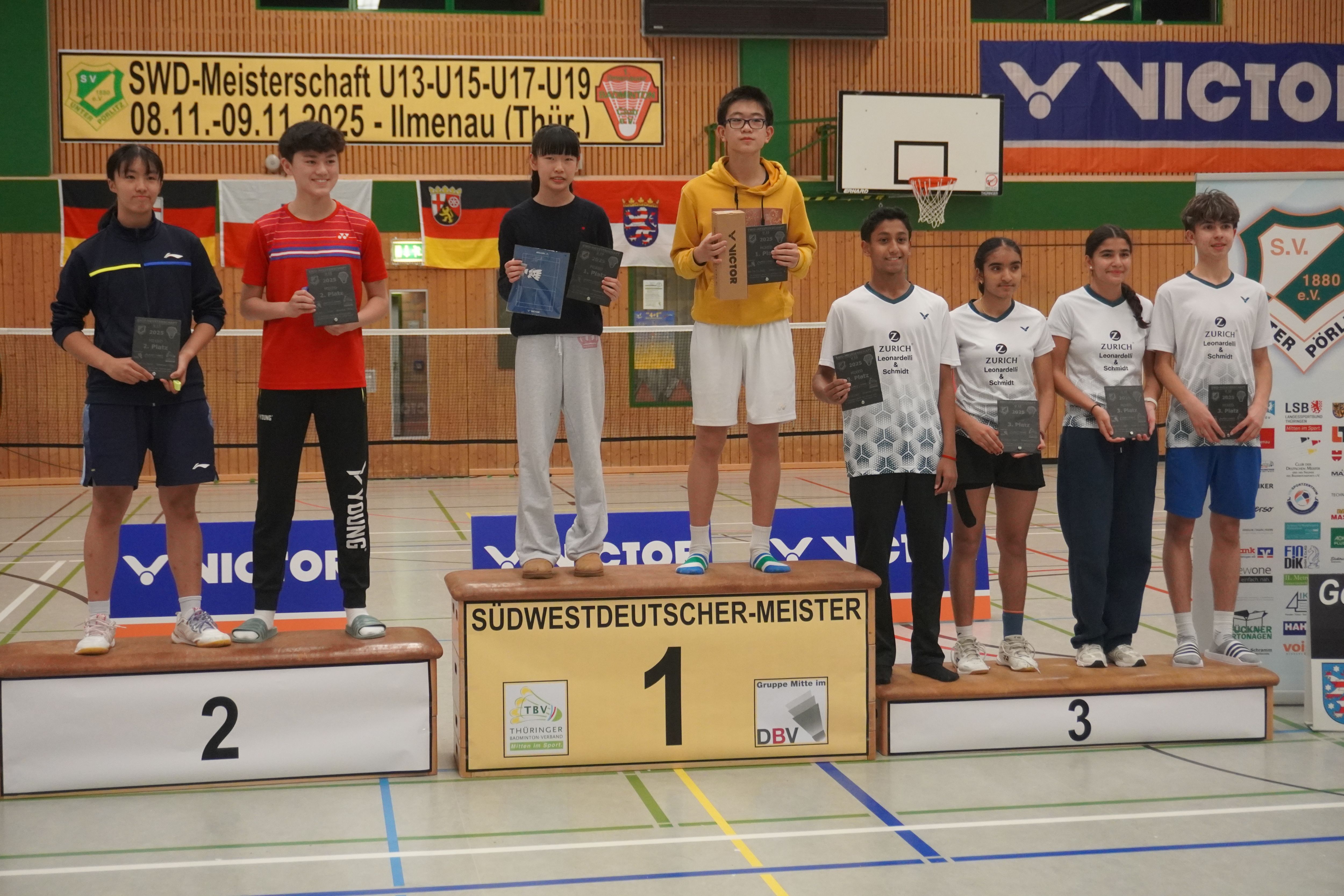 Immer wieder ein Jahreshighlight sind die Südwestdeutschen Meisterschaften, dieses Jahr gemeinschaftlich ausgerichtet von Ilmenau und Unterpörlitz in der Ilmsporthalle Ilmenau. Mit einer großen Gruppe reisten die Hessen an, die Erwartungen auf die Spiele waren groß. Gleich im Mixed konnten die Spieler ihr Können zeigen. Die Titel in der Altersklasse U15 und U17 gingen dabei an unsere hessischen Spieler und Spielerinnen, in der Altersklasse U15 waren nur Hessen auf dem Podest. Hier gewannen Leo Luo und Mira Sun (BV Maintal/Tura Niederhöchstadt) vor Tingzhou Wang und Isabella Deng (beide Tura Niederhöchstadt). Auf Platz 3 folgten Ayaan Singh und Romy Oliva sowie Hareesh Boopathy und Swara Santosh- Krishna (alle TUS Schwanheim). In der Altersklasse U17 ging das Finale kampflos an Helena Huang und Hannes Merget (TV Hofheim/ SG Anspach), nachdem Jule Meinhardt verletzungsbedingt ausfiel. Auf dem dritten Platz folgten noch Sathvik Shankar und Maya Yildiz ( TV Hofheim). In der Altersklasse U13 ging der Titel an Thüringen, Silber holten sich Harshadkumar Karthick und Chunming Yang (TG Unterliederbach und DASV), Bronze sicherte sich Jan Grabczewski (Funball Dortelweil) mit seiner Partnerin, die ungesetzt bis ins Halbfinale stürmten. In der Altersklasse U19 konnte keine hessische Paarung auf das Treppchen springen.
