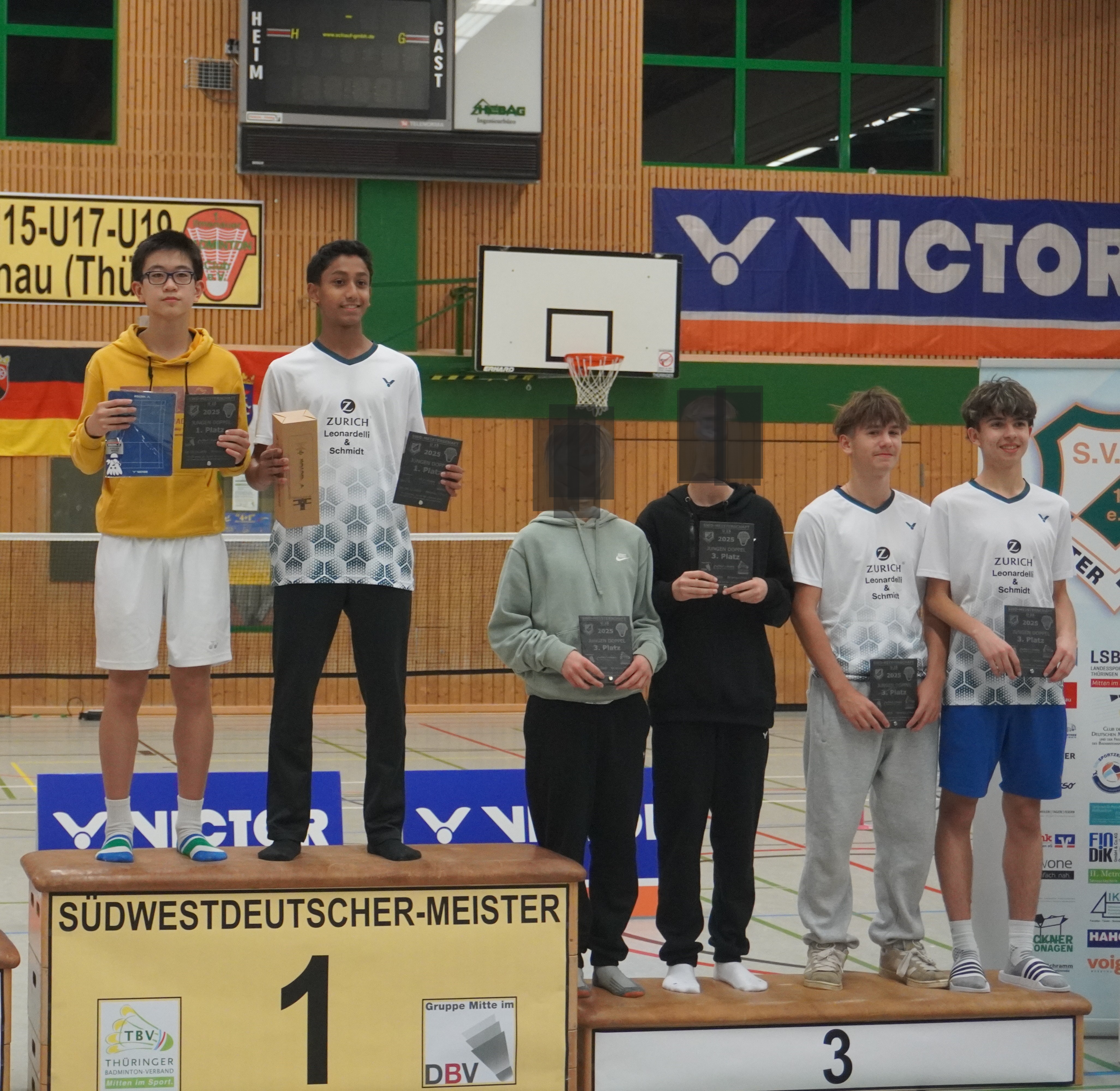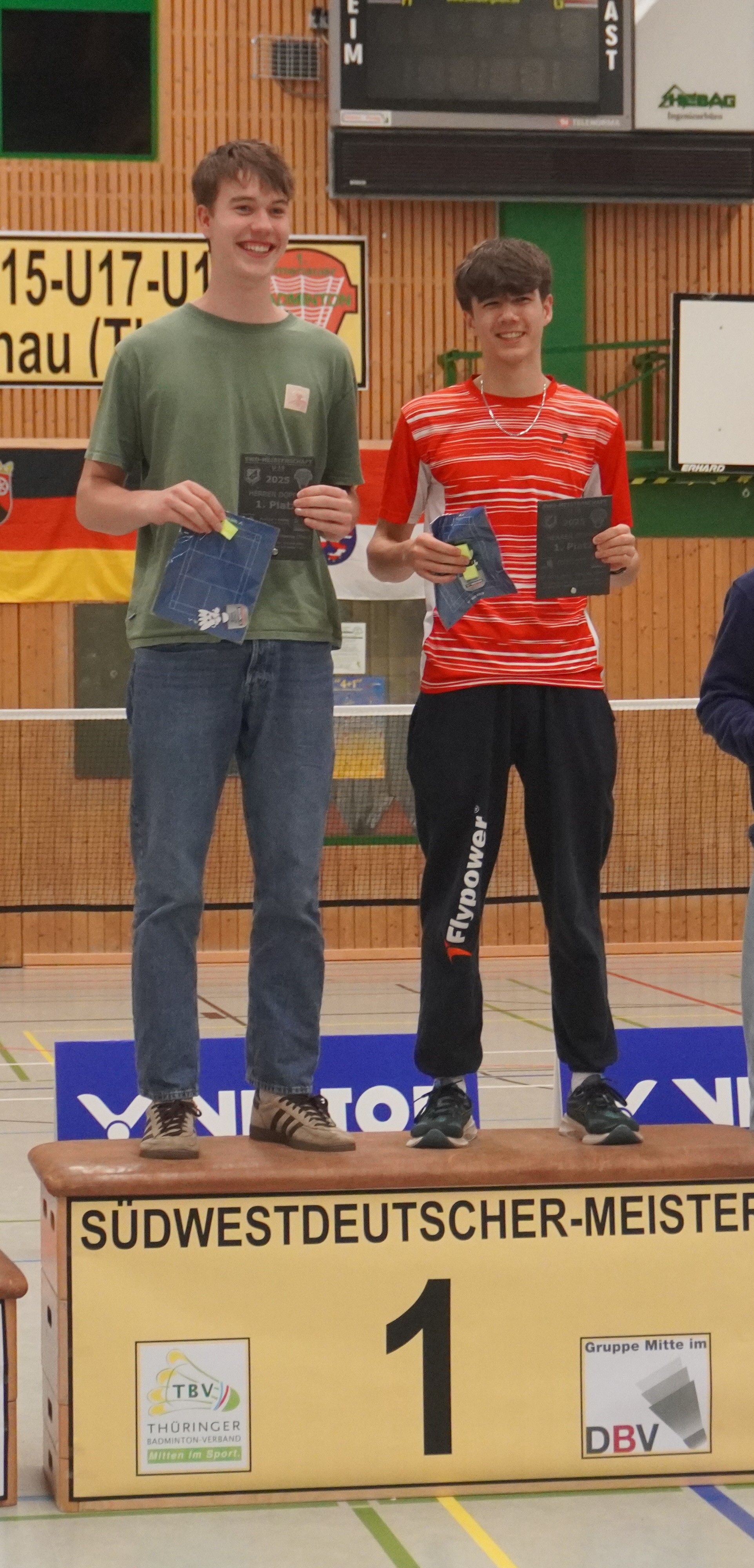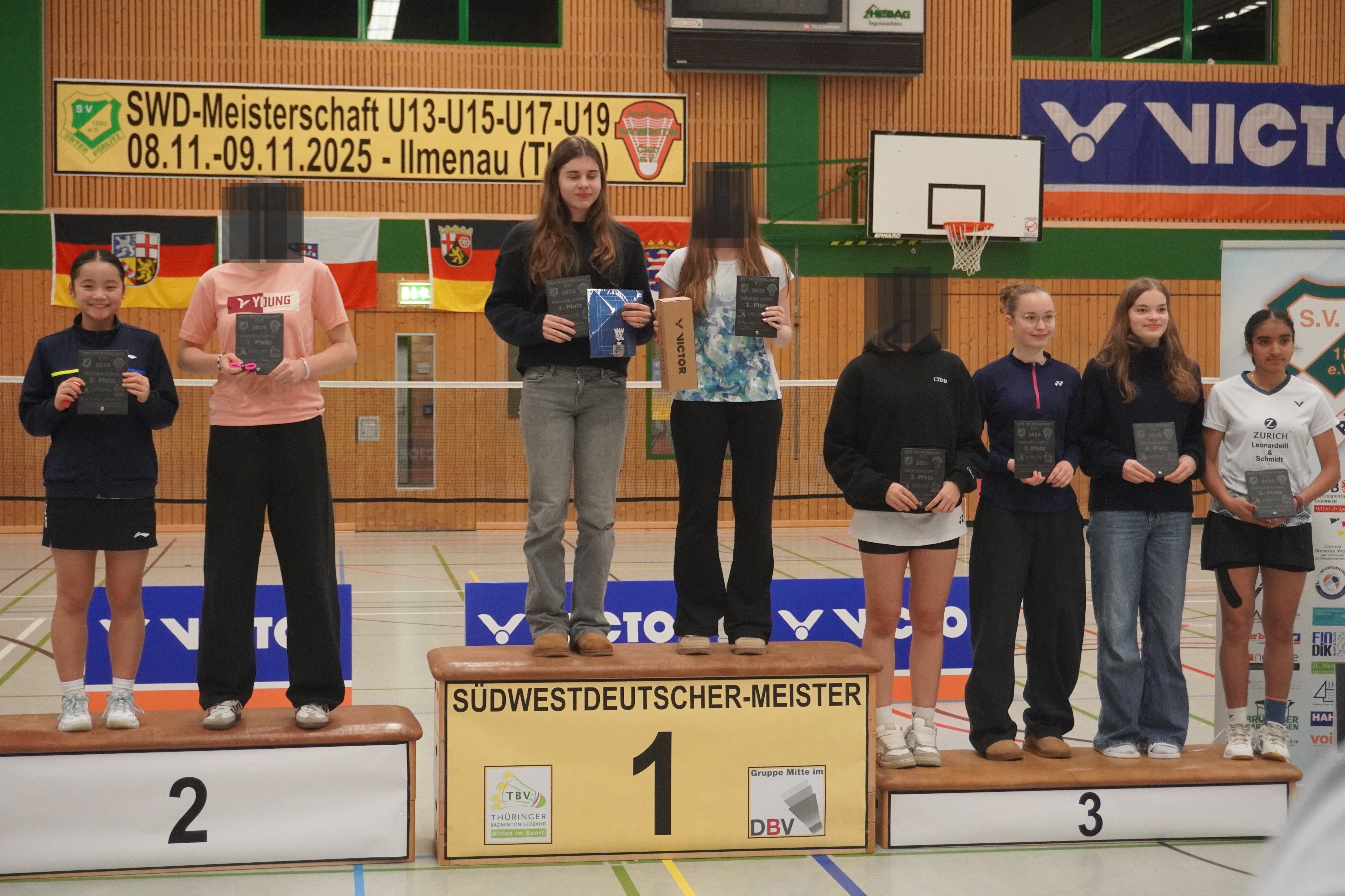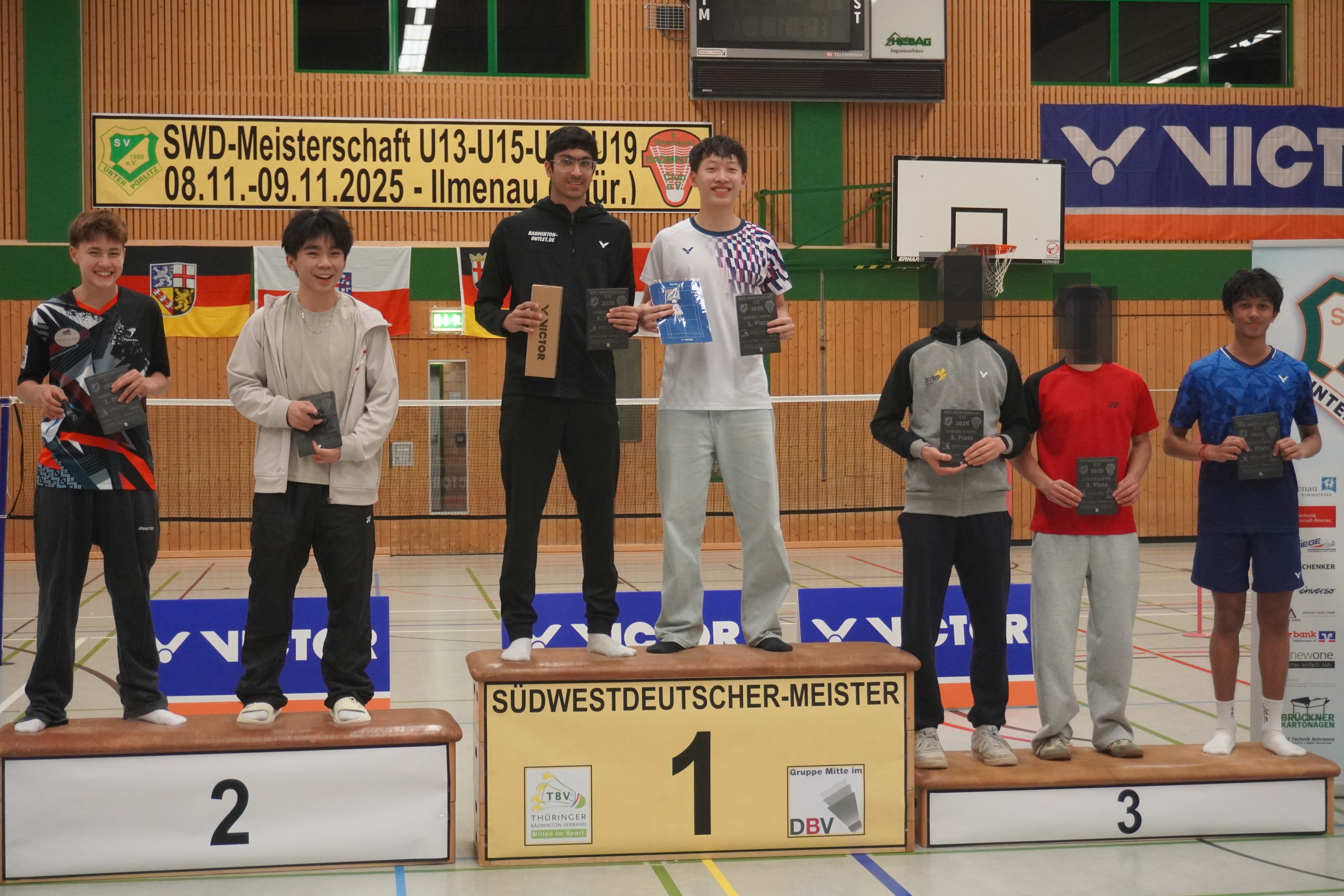 Immer wieder ein Jahreshighlight sind die Südwestdeutschen Meisterschaften, dieses Jahr gemeinschaftlich ausgerichtet von Ilmenau und Unterpörlitz in der Ilmsporthalle Ilmenau. Mit einer großen Gruppe reisten die Hessen an, die Erwartungen auf die Spiele waren groß. Gleich im Mixed konnten die Spieler ihr Können zeigen. Die Titel in der Altersklasse U15 und U17 gingen dabei an unsere hessischen Spieler und Spielerinnen, in der Altersklasse U15 waren nur Hessen auf dem Podest. Hier gewannen Leo Luo und Mira Sun (BV Maintal/Tura Niederhöchstadt) vor Tingzhou Wang und Isabella Deng (beide Tura Niederhöchstadt). Auf Platz 3 folgten Ayaan Singh und Romy Oliva sowie Hareesh Boopathy und Swara Santosh- Krishna (alle TUS Schwanheim). In der Altersklasse U17 ging das Finale kampflos an Helena Huang und Hannes Merget (TV Hofheim/ SG Anspach), nachdem Jule Meinhardt verletzungsbedingt ausfiel. Auf dem dritten Platz folgten noch Sathvik Shankar und Maya Yildiz ( TV Hofheim). In der Altersklasse U13 ging der Titel an Thüringen, Silber holten sich Harshadkumar Karthick und Chunming Yang (TG Unterliederbach und DASV), Bronze sicherte sich Jan Grabczewski (Funball Dortelweil) mit seiner Partnerin, die ungesetzt bis ins Halbfinale stürmten. In der Altersklasse U19 konnte keine hessische Paarung auf das Treppchen springen.